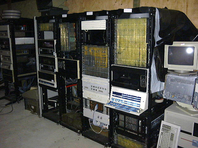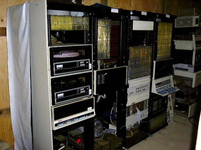 An old polaroid of the system in situ before I removed it...from left to right, 11/10 front end with 2 RK05 disks, the cpu/memory box and console, the fpu with a lot of custom h/w in the bottom of the cab, and a substantially empty cab on the right.