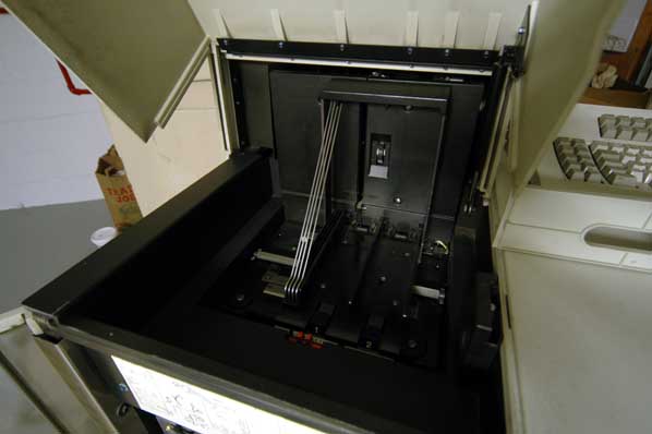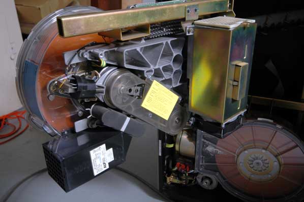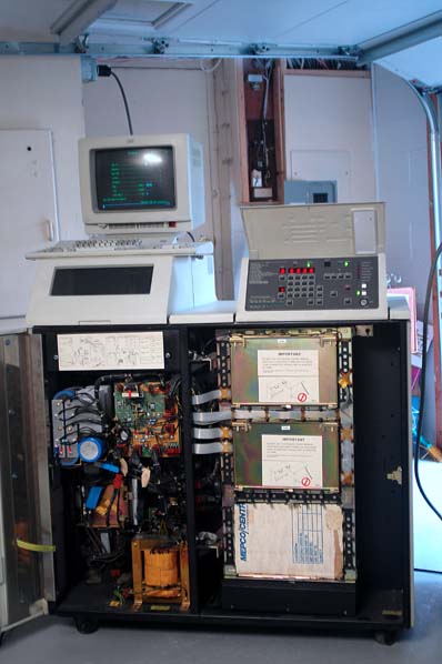 The floppy drive, with the cover open. Uses standard 8" disks, but