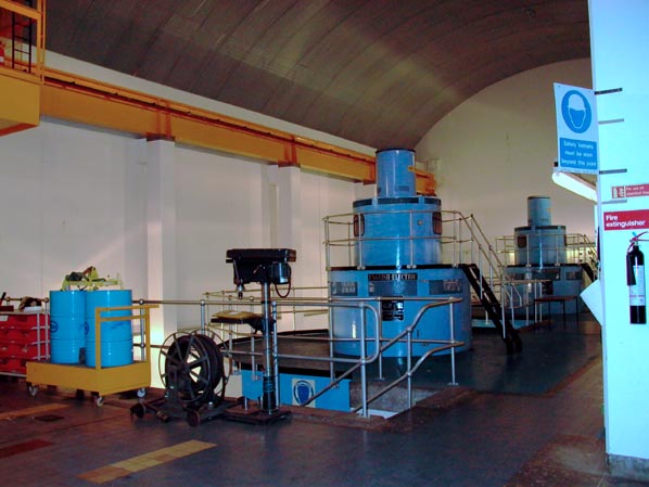 bay and access tunnel:. Photo by: Mike Ross Descending now to the turbine floor... Photo by: Mike Ross ... then ascending to the crane rails for a birds-eye (well, bats-eye except