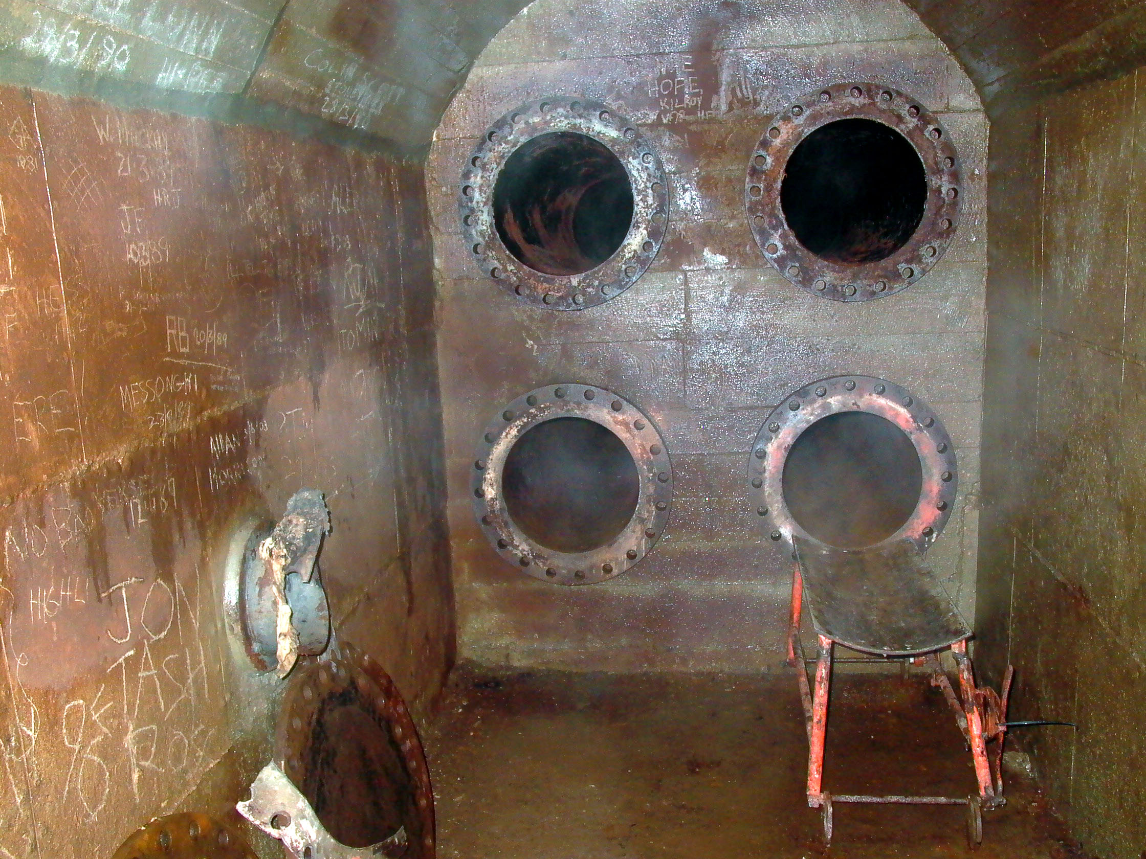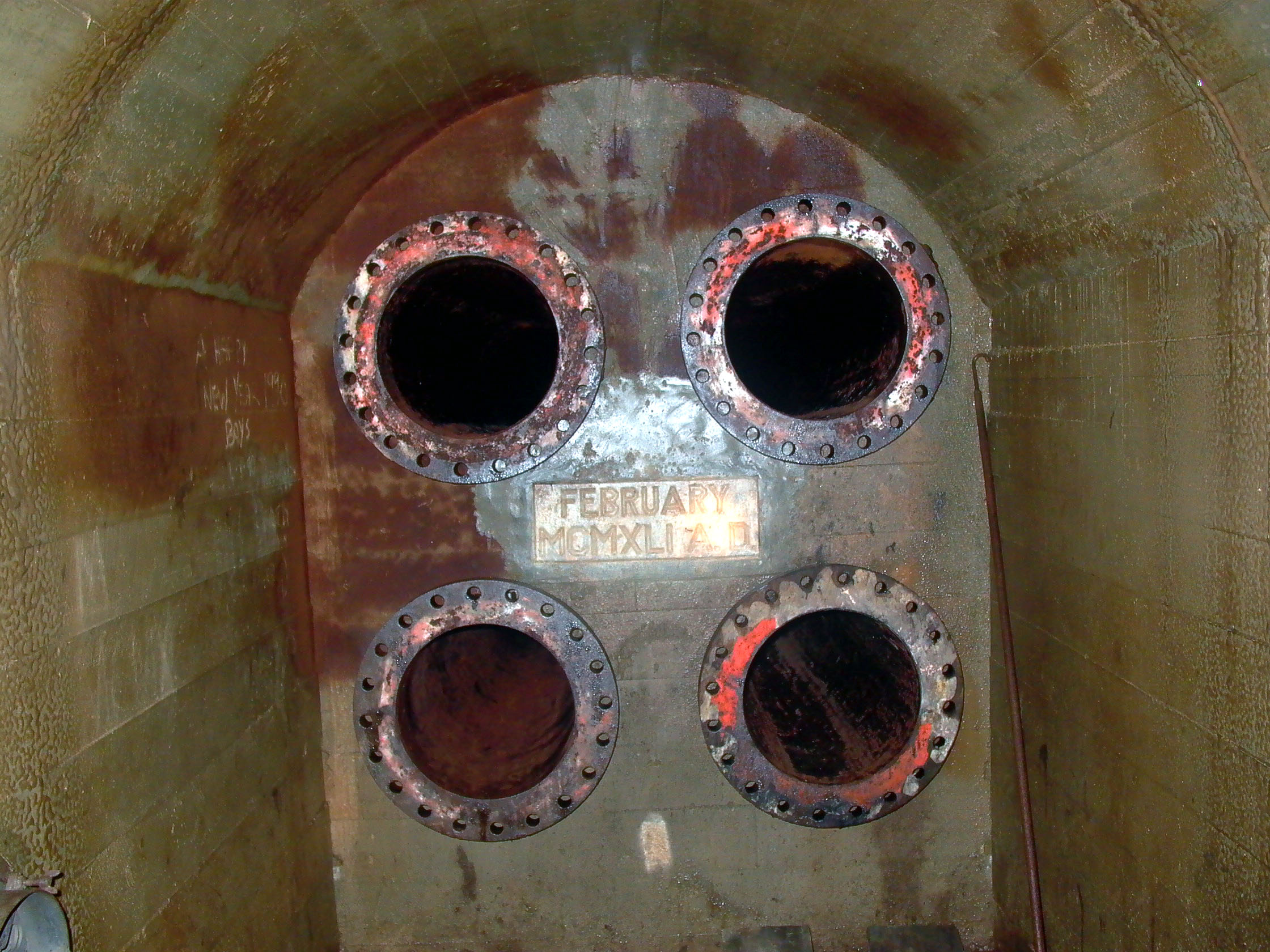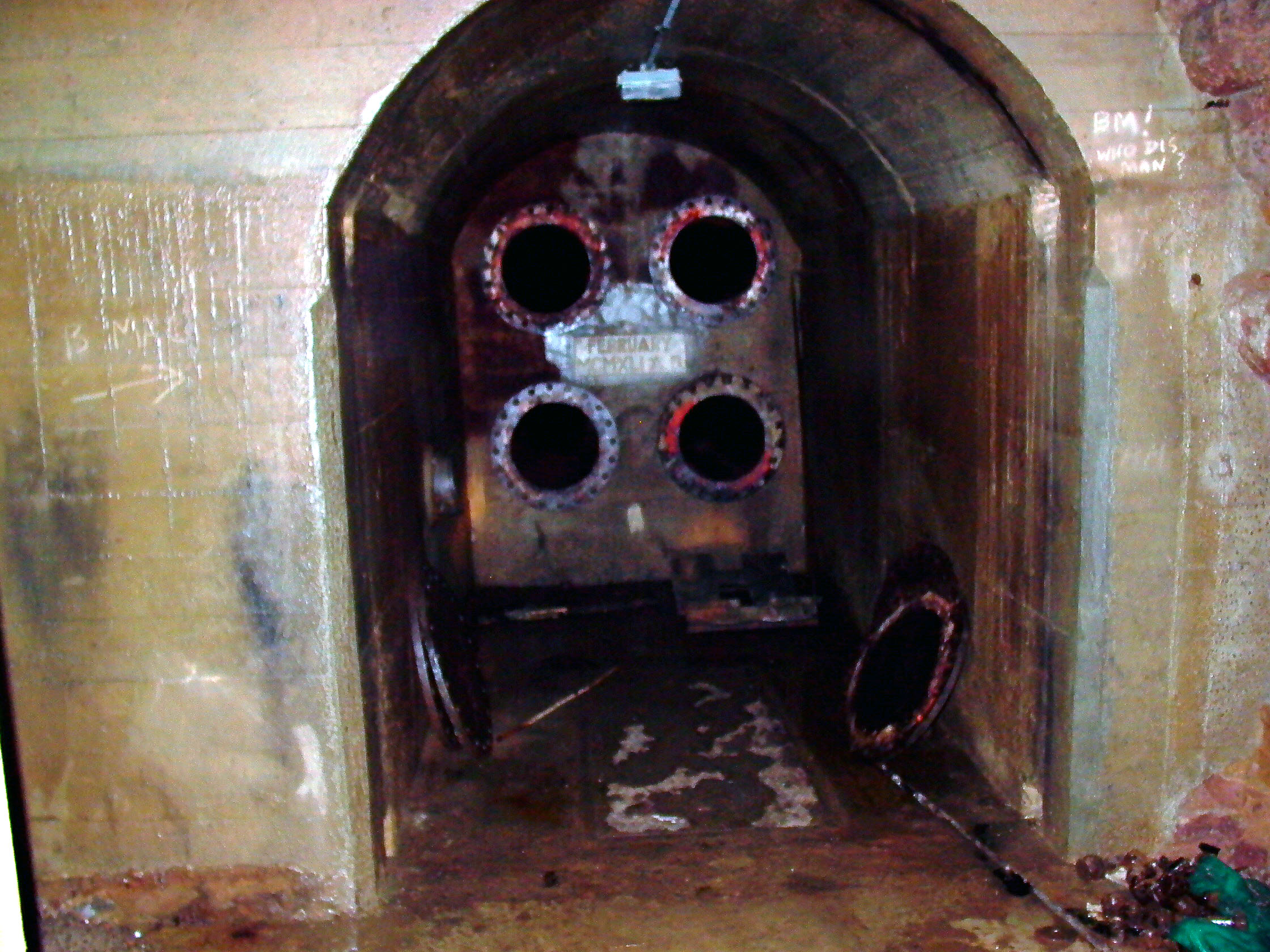 A concrete plug seals the end of one of the storage tanks. Four large pipes
