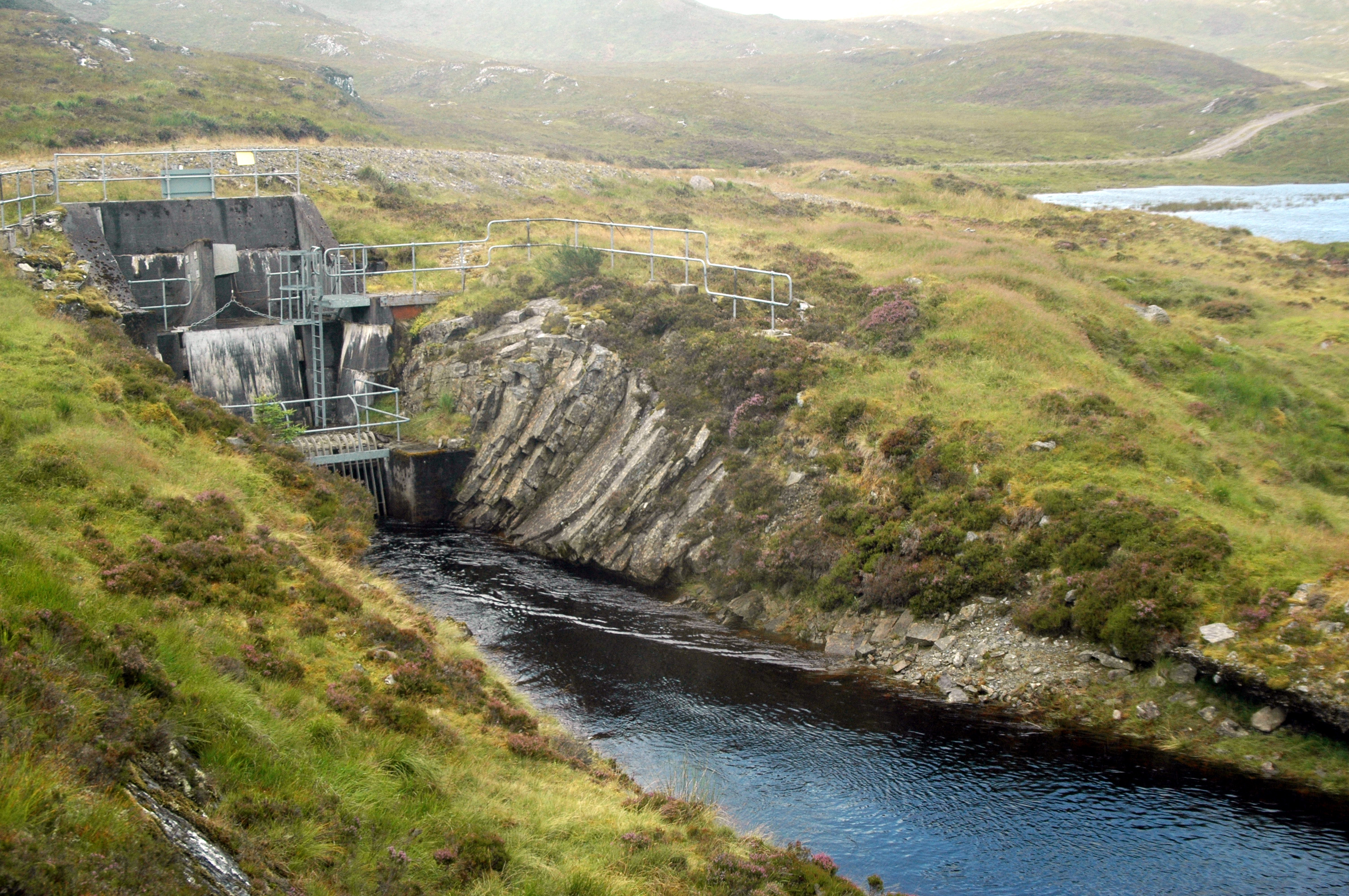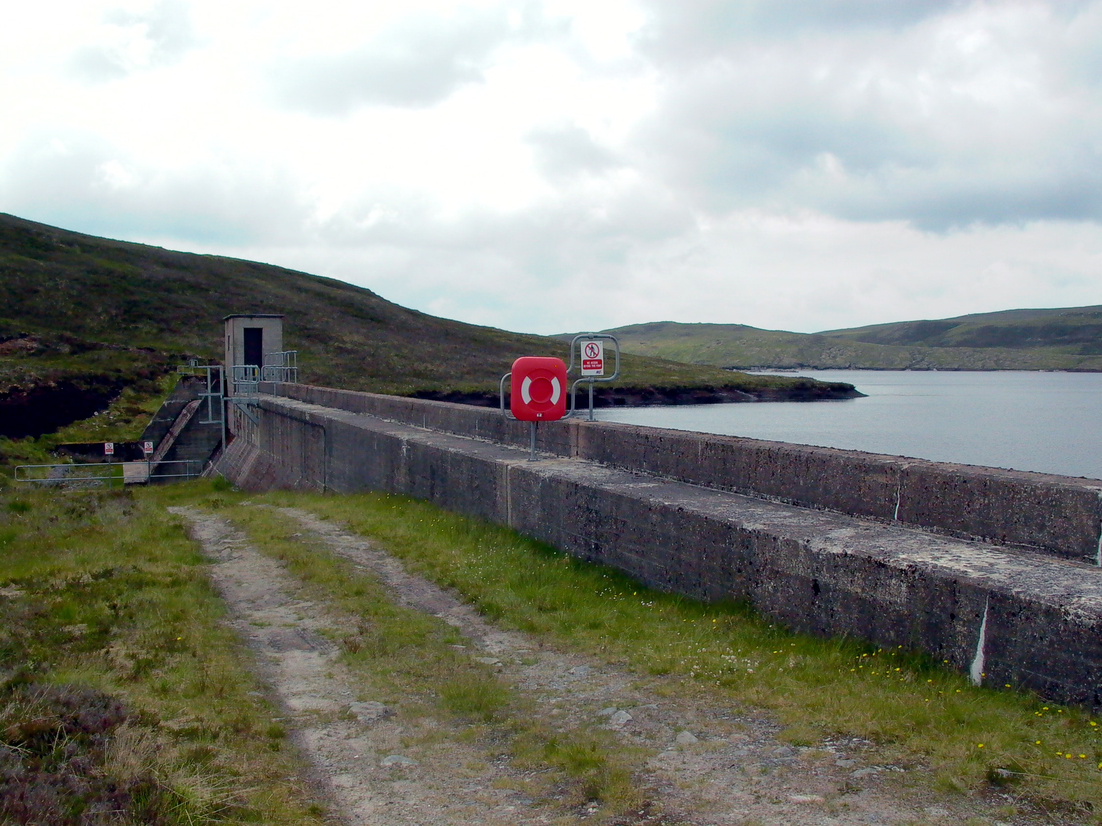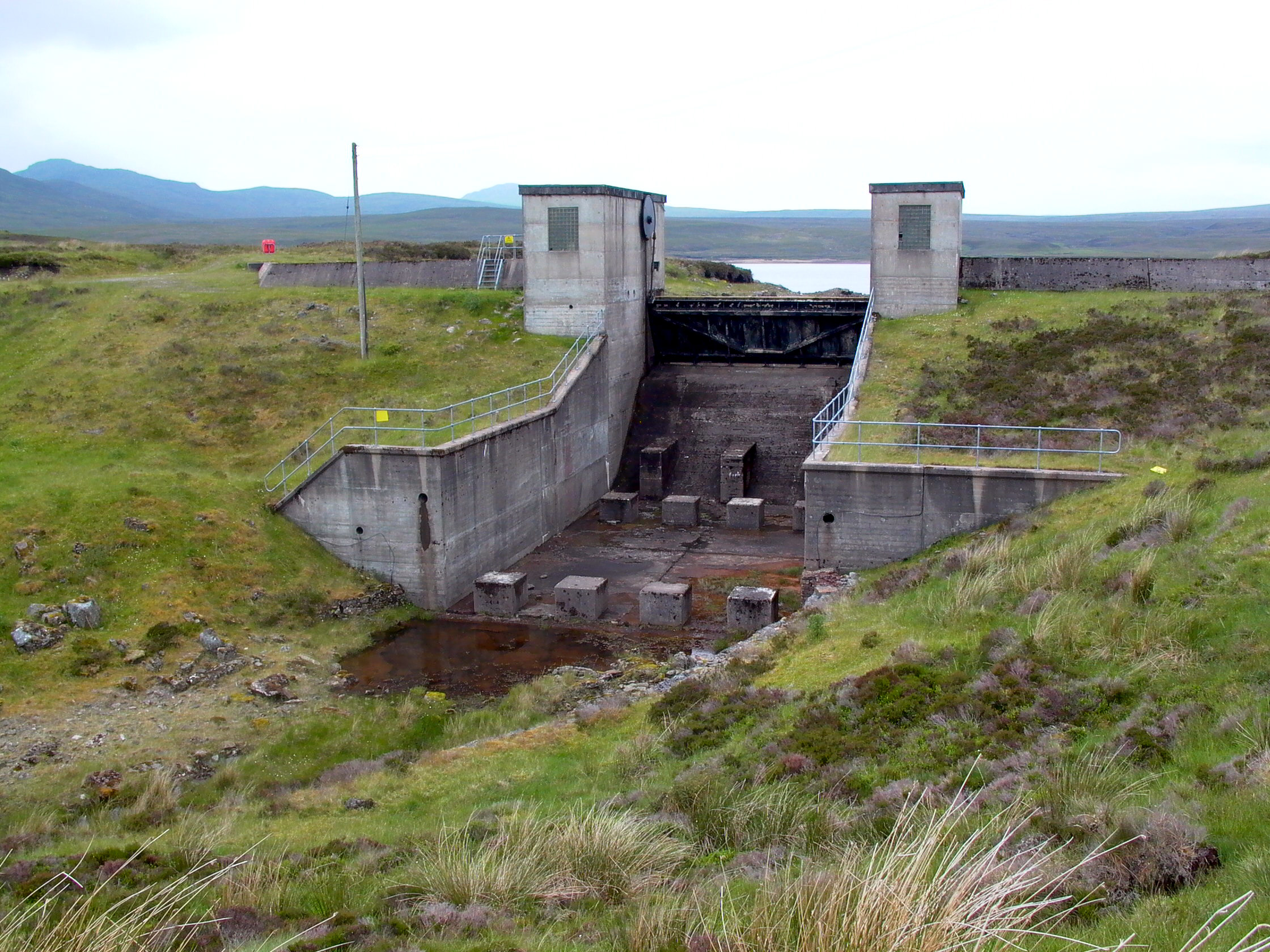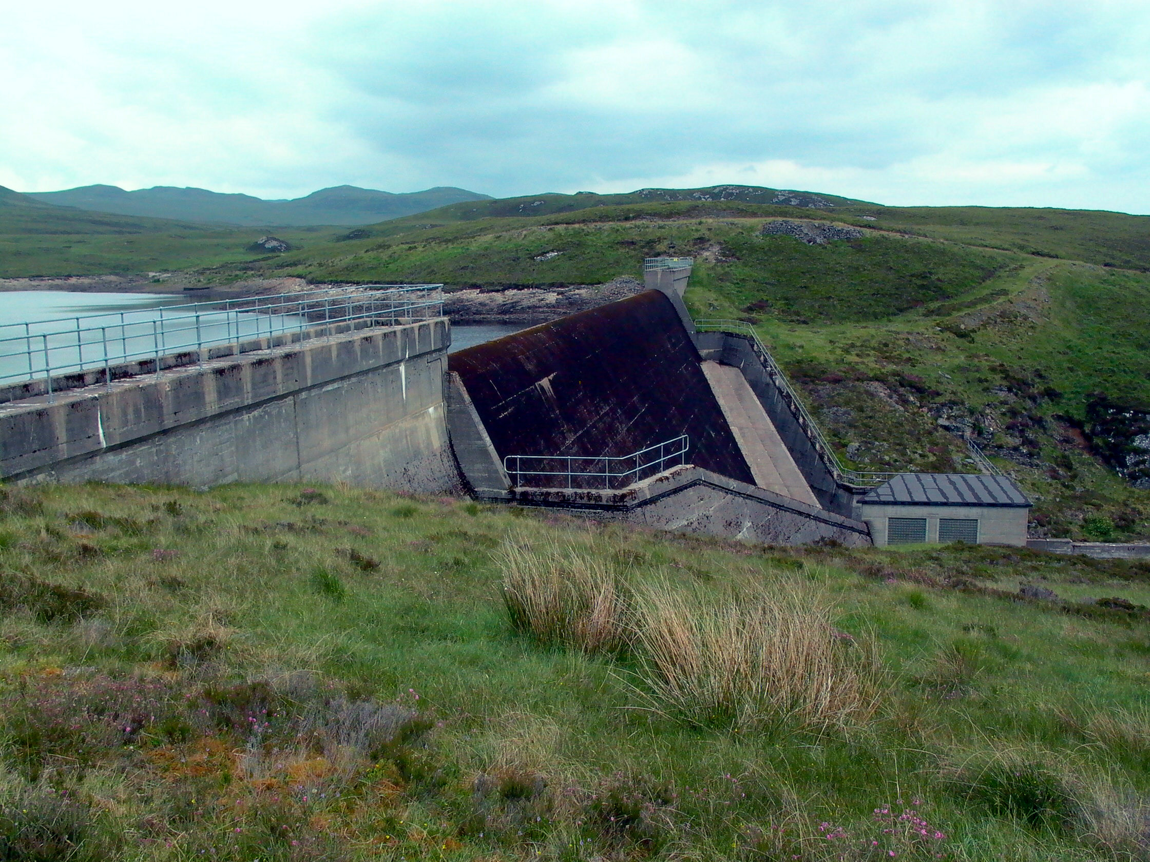 headpond at Bhlaraidh Dam. A modest dam, with a spillway along the top,