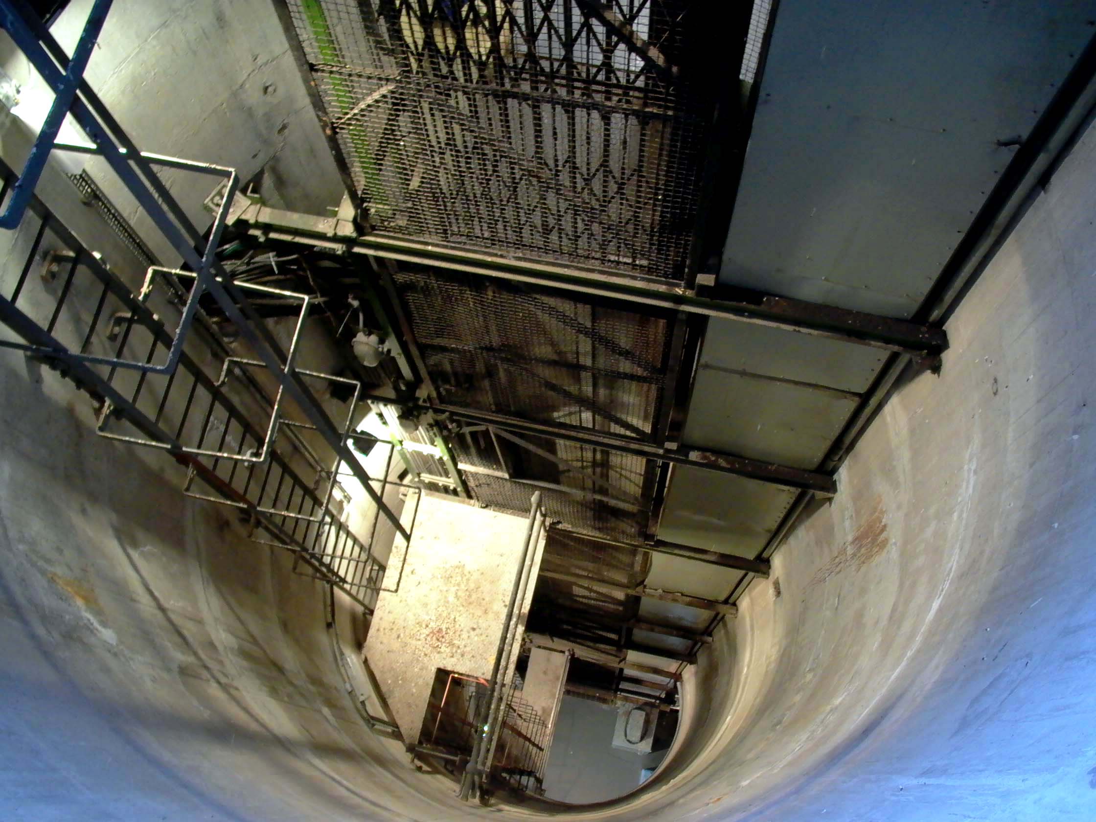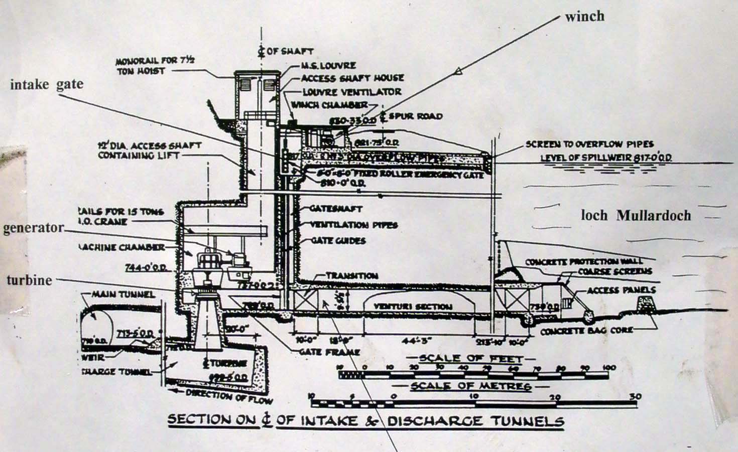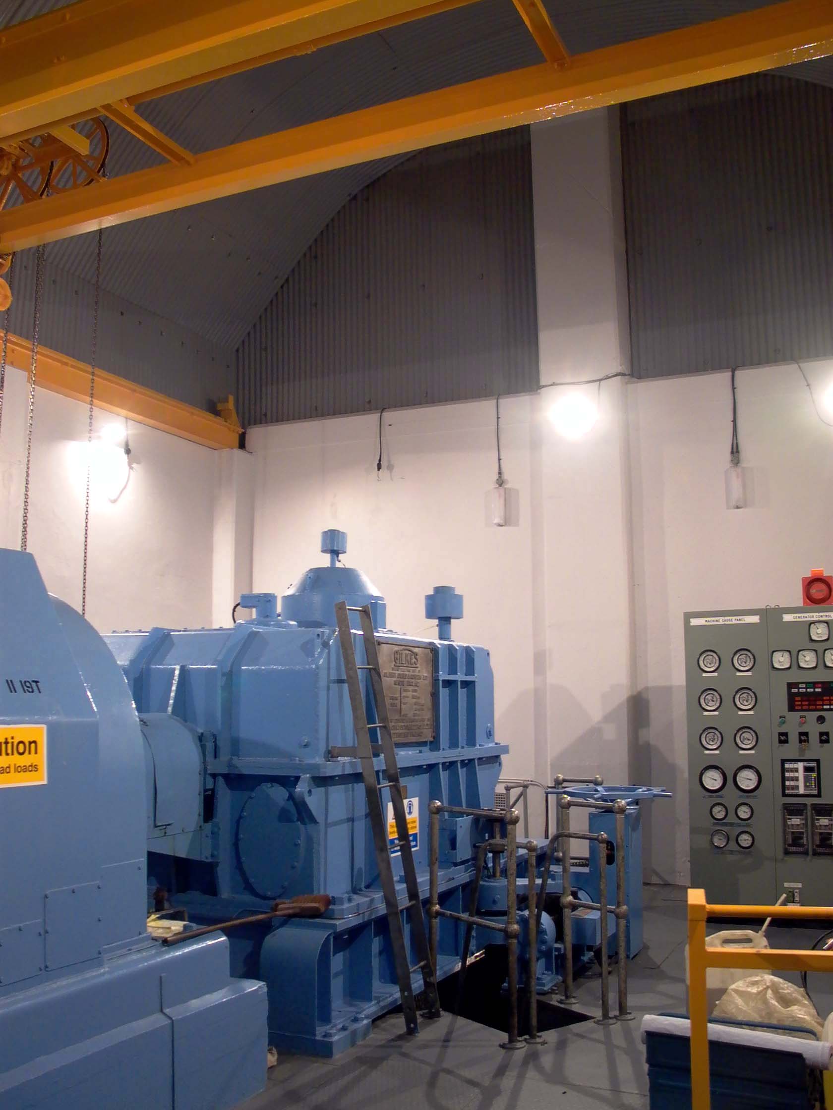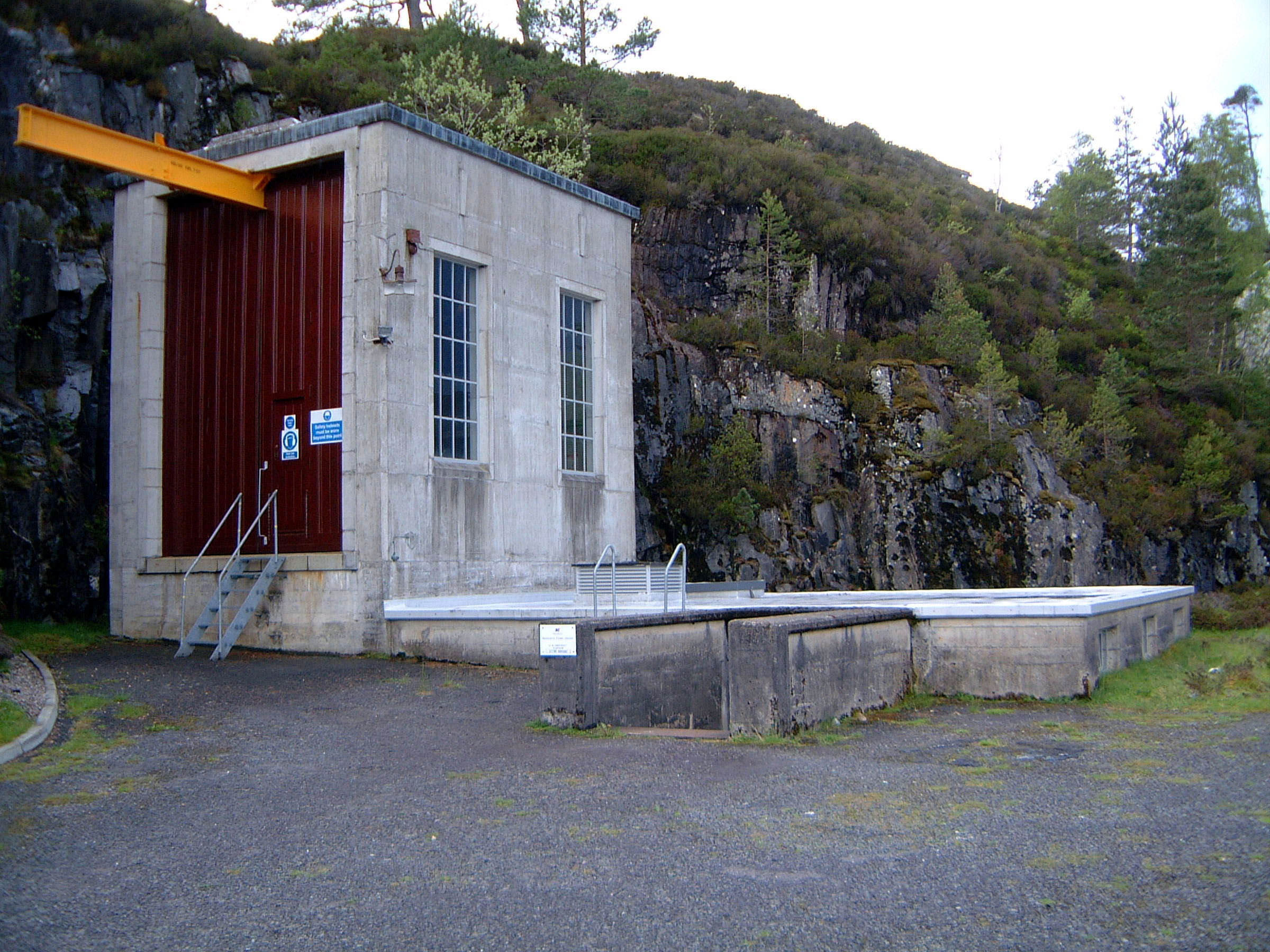 Mullardoch Dam & Power Station![]() The drawing below (click on the image for the high-resolution version) gives a good idea of the general arrangements at Mullardoch: Illustration: Mullardoch power station, general arrangementIllustration by: Photo of NOSHEB drawing by Mike Ross The surface structures of Mullardoch power station. The high building to the left surmounts the access shaft; from inside there a ladder can be descended to the power station. The I-beam is for the shaft hoist. The sunken structure to the left is primarily the winch house, but also contains lift which is the normal means of access, and the station batteries. Photo: Mullardoch power stationPhoto by: Mike Ross Descend the steps, through the door, into the sunken building - the winch house for the control gate which regulates flow of water into the power station. To the left from this point, a short passageway leads to the lift in the access shaft. Photo: Mullardoch power stationPhoto by: Mike Ross Returning outside, ascend the short metal ladder and through the door at the top of the shaft. The ladders can be seen, and the lift mechanism. Shaft drops straight to the floor of the power station - it's around 100ft. Photo: Mullardoch power stationPhoto by: Mike Ross OK... back into the low building, into the lift, down the shaft. Lift doors open... we're in the small, simple main chamber of the power station. Local control panel to the right. On the extreme left, the horizontal-shaft generator, 2.4MW. Below floor level, accessed by the short ladder visible in the centre, is the top of the vertical-shaft Francis turbine. The deeply flanged & webbed blue object in the middle is a bloody great gearbox which turns the drive through 90 degrees. Photo: Mullardoch power stationPhoto by: Mike Ross Moving forward and looking down the short ladder below the gearbox... the turbine shaft and guide vane actuators. Photo: Mullardoch power stationPhoto by: Mike Ross Turning and looking back, the lift cage and ladders at the bottom of the shaft. The blue cabin to the right of the lift is for sound-deadening and contains a telephone; what with the turbine, the gearbox, and the generator, it's bloody noisy down there. Photo: Mullardoch power stationPhoto by: Mike Ross Looking up at the point where the shaft penetrates the roof of the power station. Photo: Mullardoch power stationPhoto by: Mike Ross ...and looking directly up the shaft to the crane beam in the surface building. Photo: Mullardoch power stationPhoto by: Mike Ross Home Page Last updated 8th May 2004 Style © 1998-2001 Subterranea Britannica Words and images © 2004 Michael J. Ross |