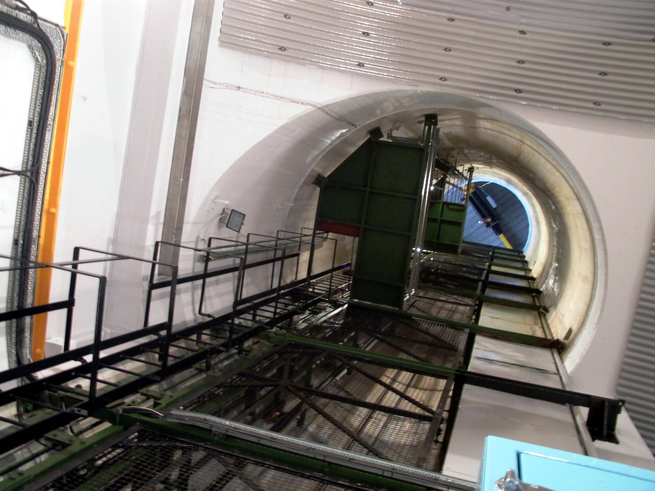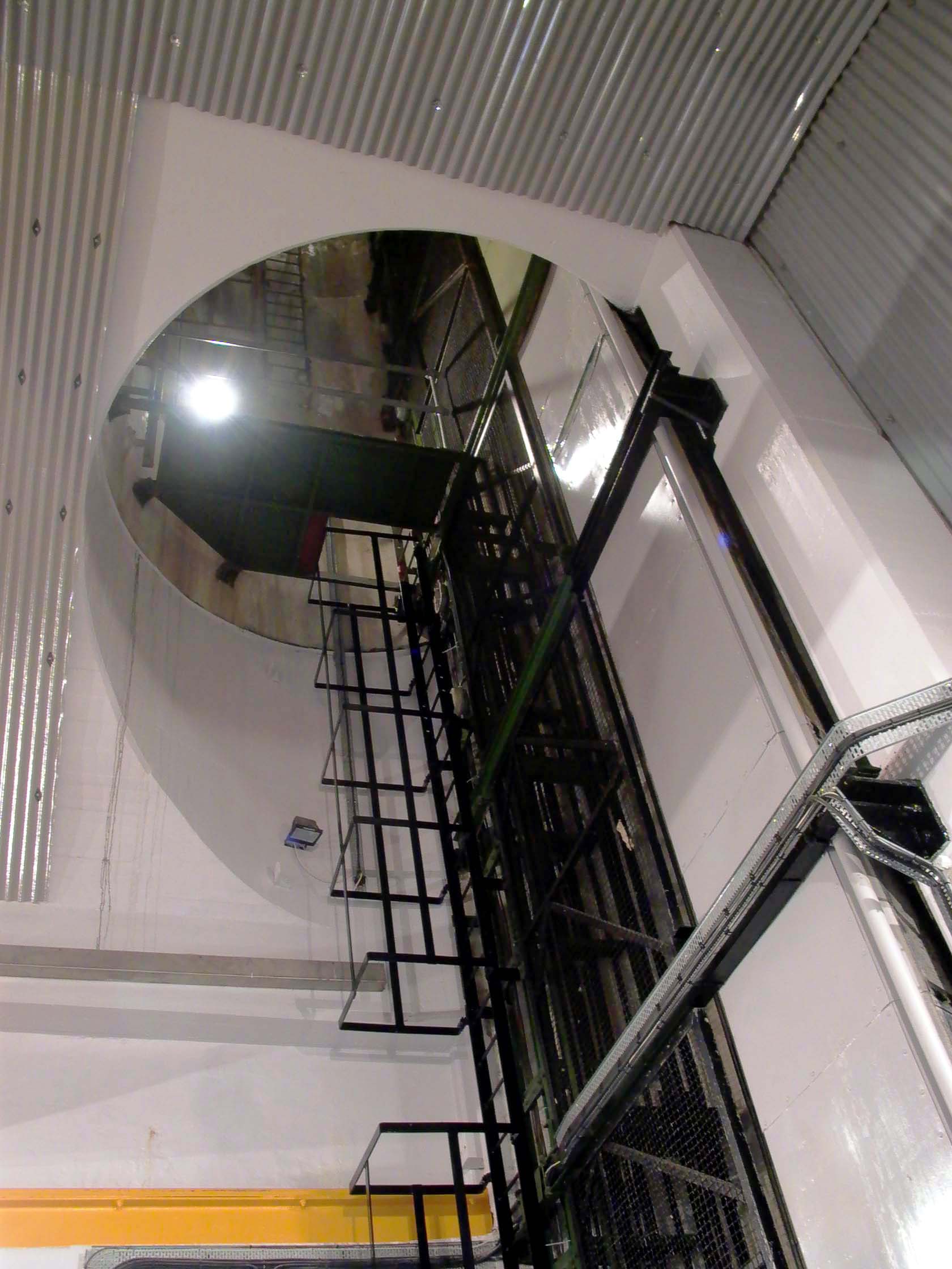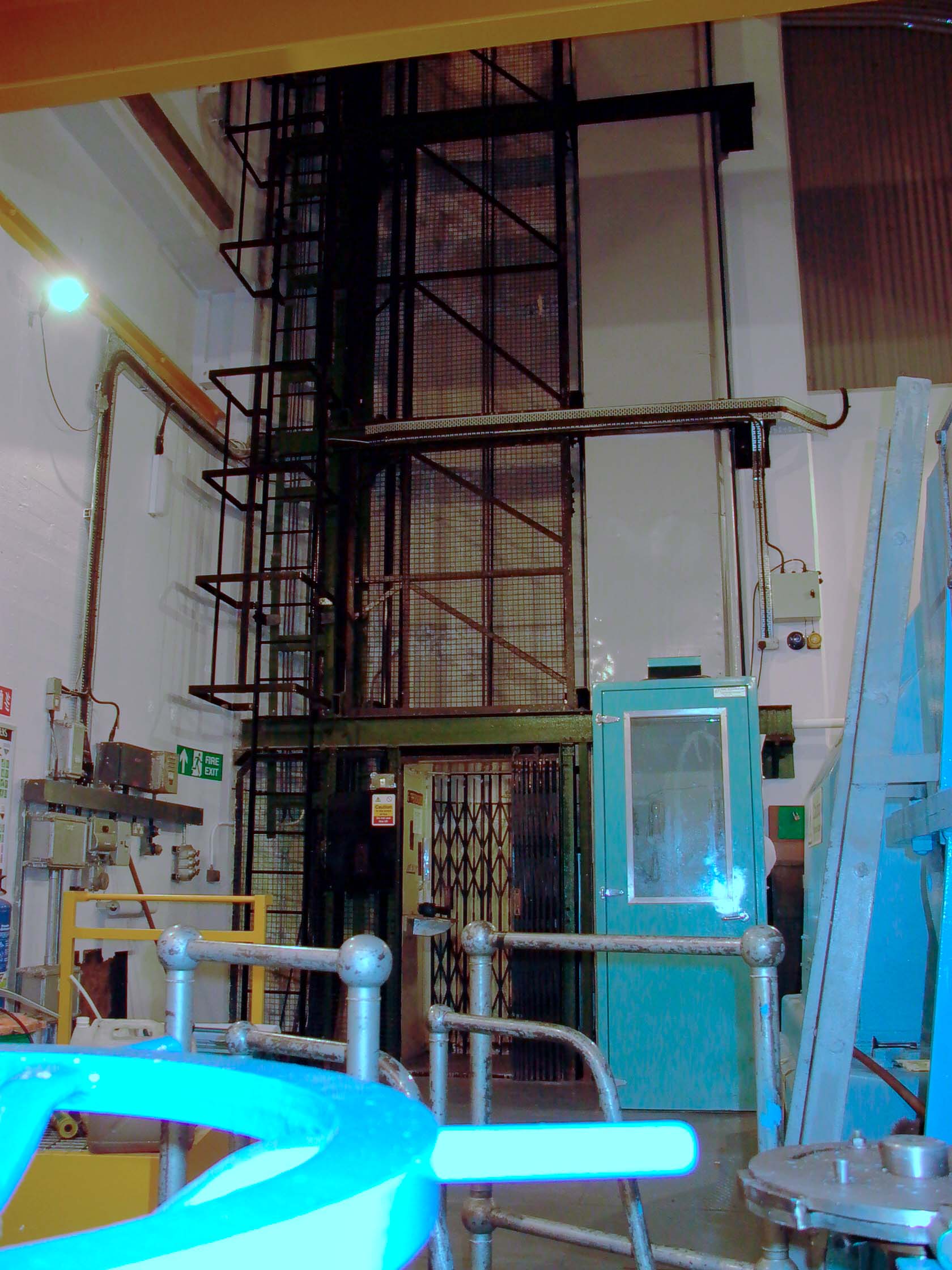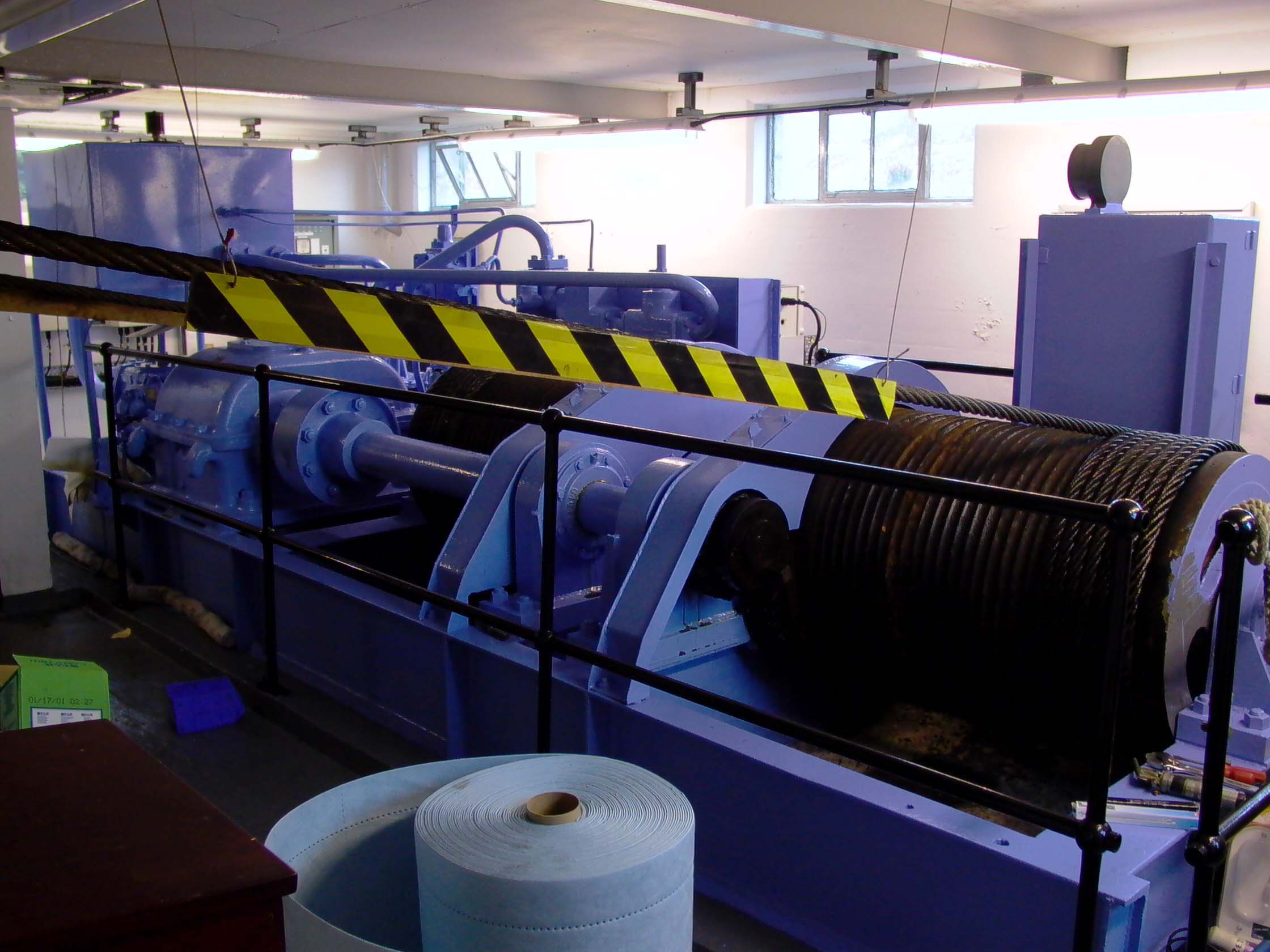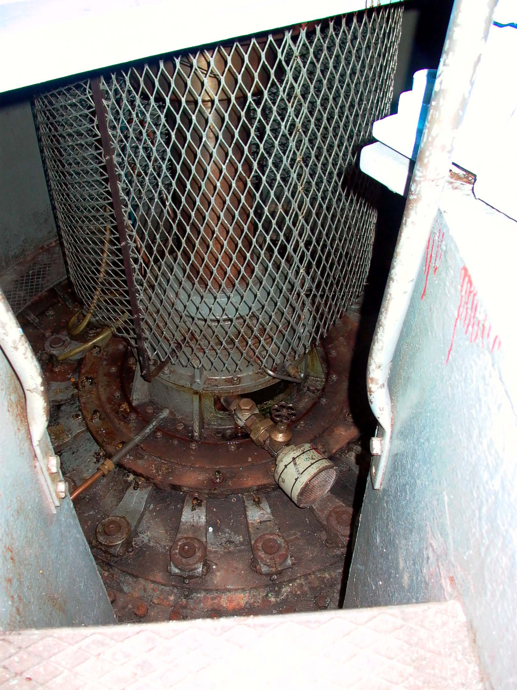 Mullardoch Dam & Power Station![]() The drawing below (click on the image for the high-resolution version) gives a good idea of the general arrangements at Mullardoch: Illustration: Mullardoch power station, general arrangementIllustration by: Photo of NOSHEB drawing by Mike Ross The surface structures of Mullardoch power station. The high building to the left surmounts the access shaft; from inside there a ladder can be descended to the power station. The I-beam is for the shaft hoist. The sunken structure to the left is primarily the winch house, but also contains lift which is the normal means of access, and the station batteries. Photo: Mullardoch power stationPhoto by: Mike Ross Descend the steps, through the door, into the sunken building - the winch house for the control gate which regulates flow of water into the power station. To the left from this point, a short passageway leads to the lift in the access shaft. Photo: Mullardoch power stationPhoto by: Mike Ross Returning outside, ascend the short metal ladder and through the door at the top of the shaft. The ladders can be seen, and the lift mechanism. Shaft drops straight to the floor of the power station - it's around 100ft. Photo: Mullardoch power stationPhoto by: Mike Ross OK... back into the low building, into the lift, down the shaft. Lift doors open... we're in the small, simple main chamber of the power station. Local control panel to the right. On the extreme left, the horizontal-shaft generator, 2.4MW. Below floor level, accessed by the short ladder visible in the centre, is the top of the vertical-shaft Francis turbine. The deeply flanged & webbed blue object in the middle is a bloody great gearbox which turns the drive through 90 degrees. Photo: Mullardoch power stationPhoto by: Mike Ross Moving forward and looking down the short ladder below the gearbox... the turbine shaft and guide vane actuators. Photo: Mullardoch power stationPhoto by: Mike Ross Turning and looking back, the lift cage and ladders at the bottom of the shaft. The blue cabin to the right of the lift is for sound-deadening and contains a telephone; what with the turbine, the gearbox, and the generator, it's bloody noisy down there. Photo: Mullardoch power stationPhoto by: Mike Ross Looking up at the point where the shaft penetrates the roof of the power station. Photo: Mullardoch power stationPhoto by: Mike Ross ...and looking directly up the shaft to the crane beam in the surface building. Photo: Mullardoch power stationPhoto by: Mike Ross Home Page Last updated 8th May 2004 Style © 1998-2001 Subterranea Britannica Words and images © 2004 Michael J. Ross |