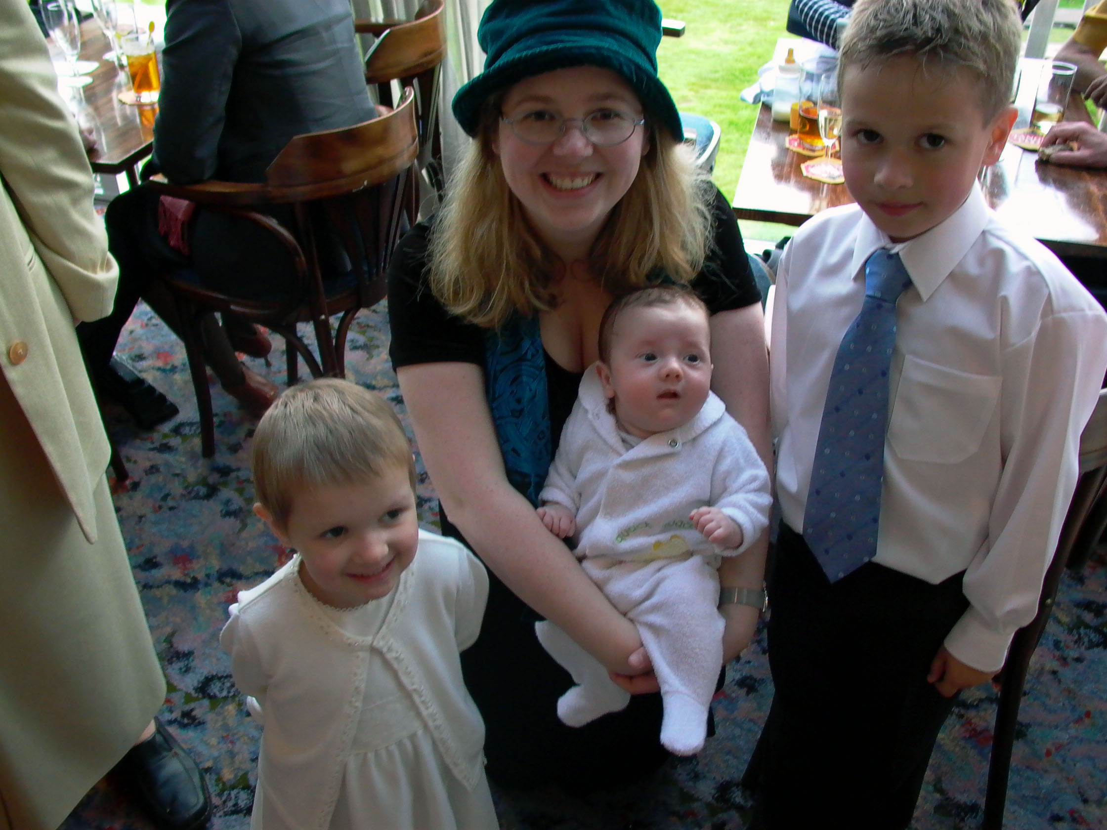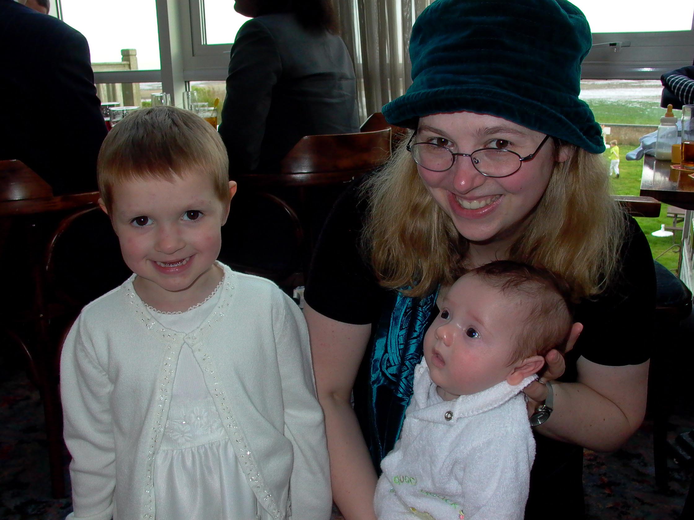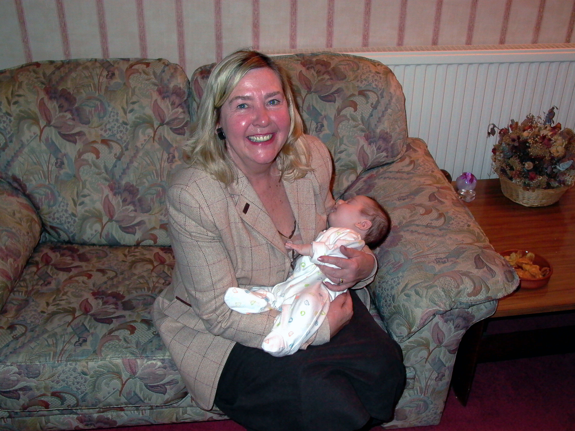 | Iain - with Clan Gordon After visiting Dingwall, and one set of grandparents, our next mission was to Eaglesham, and the other set of grandparents! Iain and granny Gordon Iain and the Carricks (friends of Gordon family) Iain wiggling with his cousins (age 6 weeks) (Iain, not the cousins!!) Iain and Mattie Scobie (another Gordon friend) Iain and Margaret Brown On our way further South, to a Gordon family gathering, we stopped off to visit our old friends Jon & Chris... and their daughter Meriel. Jon & Meri wiggle, whilst... ...Iain has a well-earned nap! Another stop: London - our old friend Sue, Iain on one arm, and Ryan (son of another friend, Jackie Lynch) on the other. Down to Portsmouth... Iain (two months old now!) with his uncle Andy and auntie Mel Iain and our beloved niece Cate, who was sadly lost to us in February 2004 Another pic of Iain and Cate Iain, Cate, and her big brother Tom. Iain getting a cuddle from mummy Click on the pics for full-size versions |
