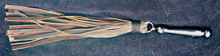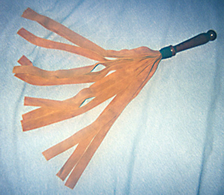 A heavy leather flogger made of 20 strands of 3/16" inch thick, approximately 3/8" to 1/2" in width, leather strips. This is medium to severe+, depending on the stroke. Extremely pleasurable with very effort. |