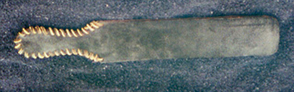 This is a nice warm-up strap. Made of two or three bonded layers of 1/8" leather. Overall size is 15" in length, with a 10 by 2 1/2" blade. The handle is accent with leather lacing. The two layer handle is reinforced with a thin strip of spring steel. Small enough for those sensitive areas, large enough for discipline. |