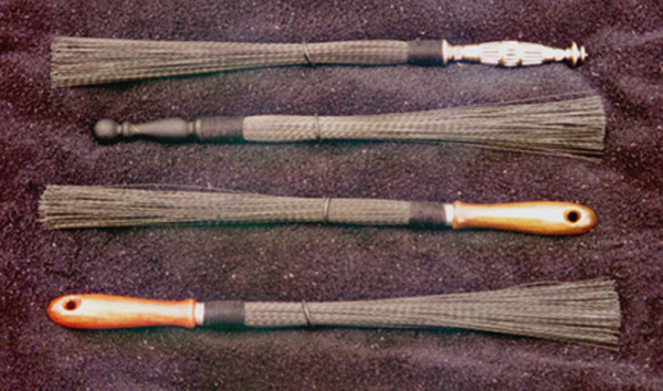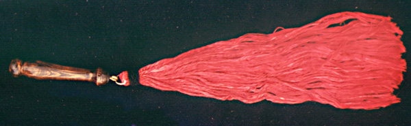 The Wisk. Of Master's own personal design and creation, the Wisk truly defies description. It can be used in so many different way, and can be rated from mild to severe depending on application. It is 19 inches in length, and approximatly 3/4" in diameter of stiff, zig-zagged poly-strands. The "O" ring is intended for storage, but can be used to help control the amount of flair, although it will come off during heavy use. It is available with the light weight wooden handles, as well as, heavy metal handles. (Brass handles coming soon.) The affect? According to some very satisfied customers, the affect ranges from being similar to a serious bundle of switches (and yet different) to a mass of bee stings. This all depends on length of time used, how hard it's used, where it is applied. This is a toy that can truly be different with each and every use. |